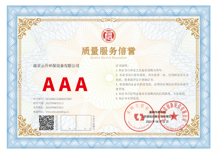 南京云升環(huán)保設(shè)備有限公司全體員工愿以環(huán)境保護為己任,以市場為導(dǎo)向,以優(yōu)質(zhì)服務(wù)為原則,嚴(yán)格的管理、先進的生產(chǎn)工藝、至上的品質(zhì)、完善的售前售后服務(wù),與廣大新老用戶攜手并進,共鑄輝煌。公司已通過ISO9001:2000質(zhì)量管理體系標(biāo)準(zhǔn)認證,成為江蘇省高新企業(yè),并進行不斷的技術(shù)改進和創(chuàng)新,為客戶和合作伙伴提供滿意的產(chǎn)品。